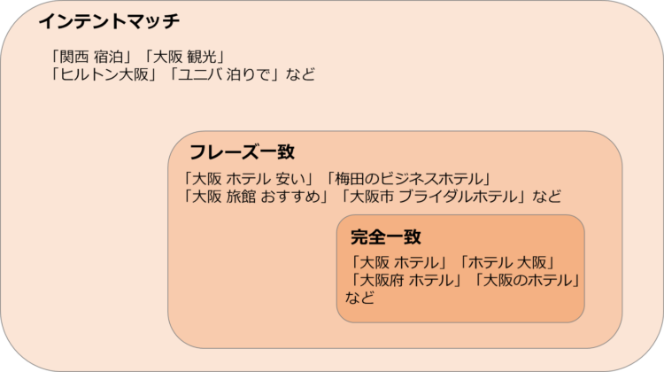 たとえば「大阪 ホテル」というキーワードの場合、3つのマッチタイプ例は以下のイメージです。