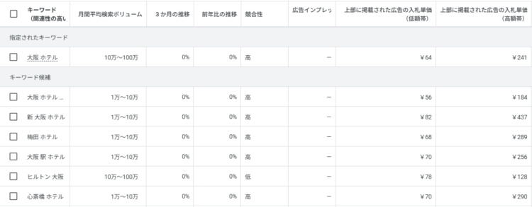 「大阪 ホテル」の入札単価(≒クリック単価)は64円~241円でした。実際の価格は競合のオークション入札状況や、広告の品質などによって変動するため、キーワードプランナーの上限と下限にはある程度幅があります。