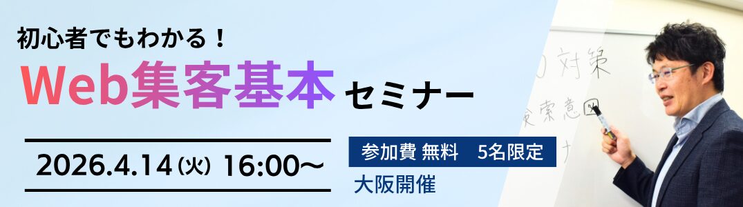 | 対象 | ・中小企業の経営者の方 ・自社の売上/集客に立場を取られている方 ・ウェブサイトの責任者、マーケティング担当者の方 ・自社のウェブ戦略の将来に、漠然とした不安を感じている方 ・AI時代に対応し、乗り遅れないようにしたいと考えている方 |
